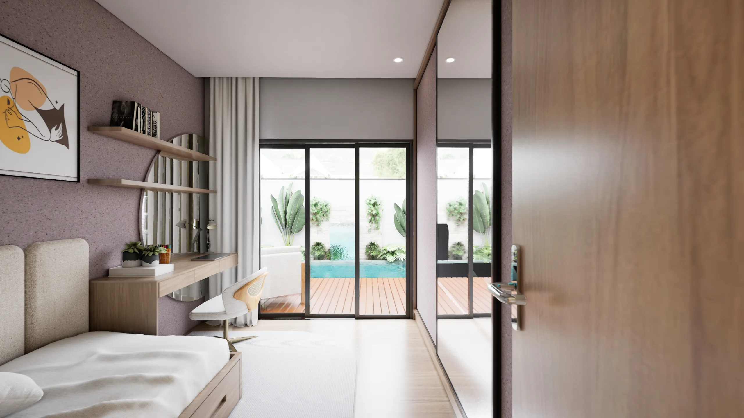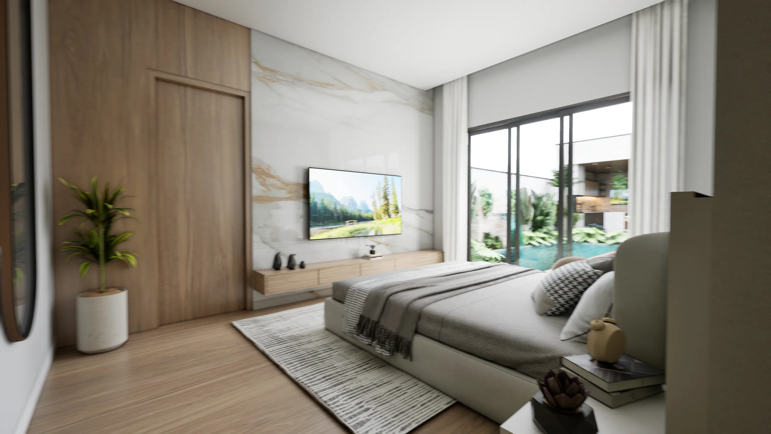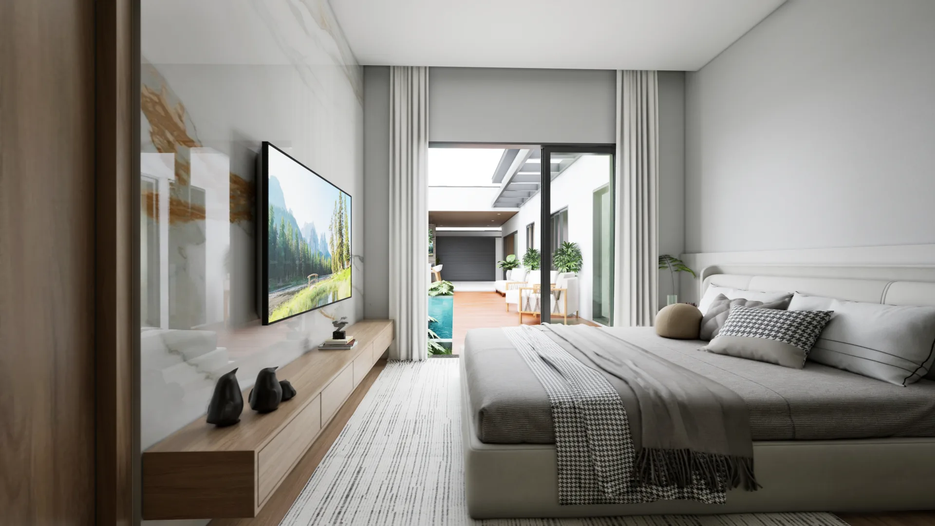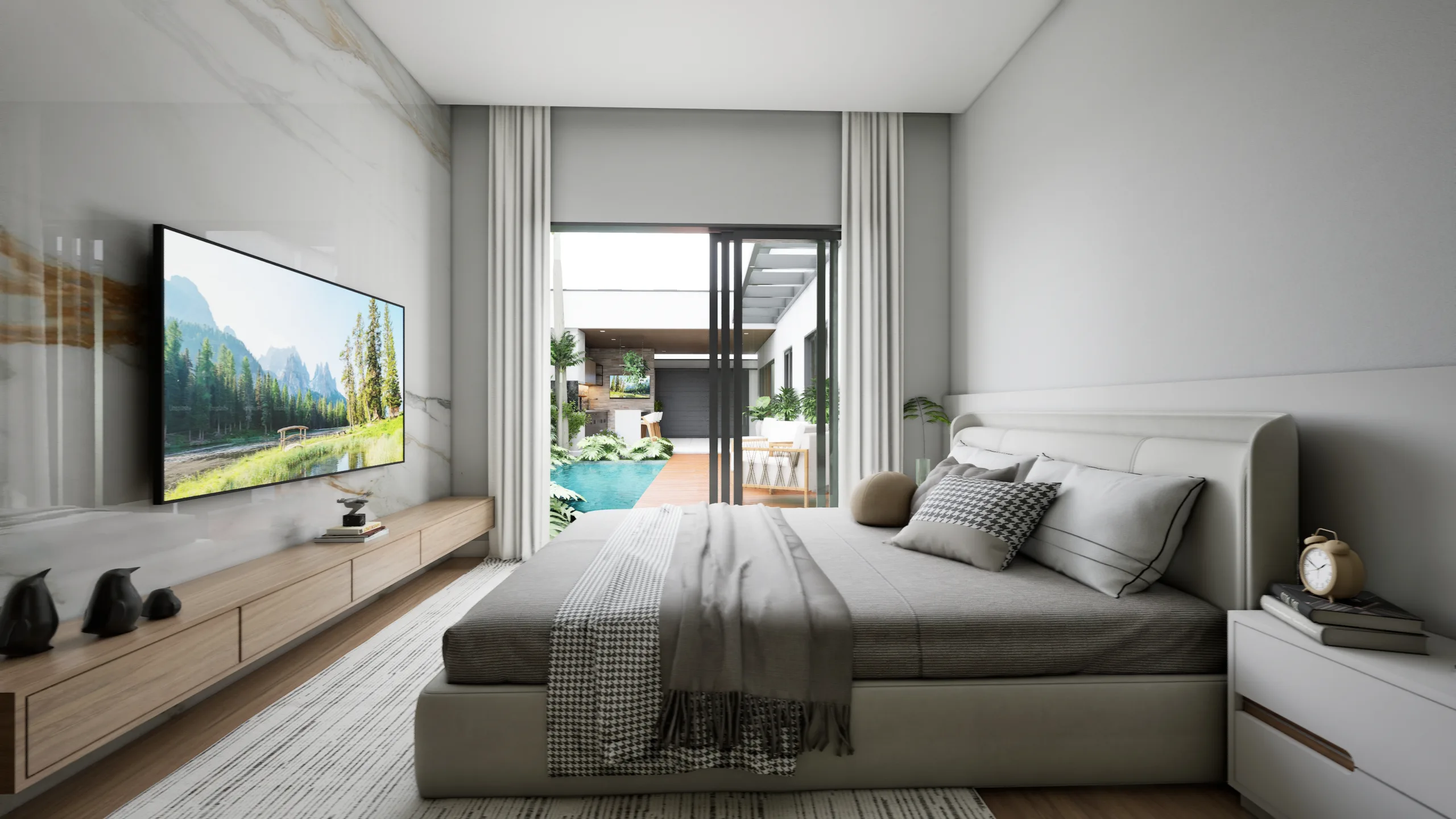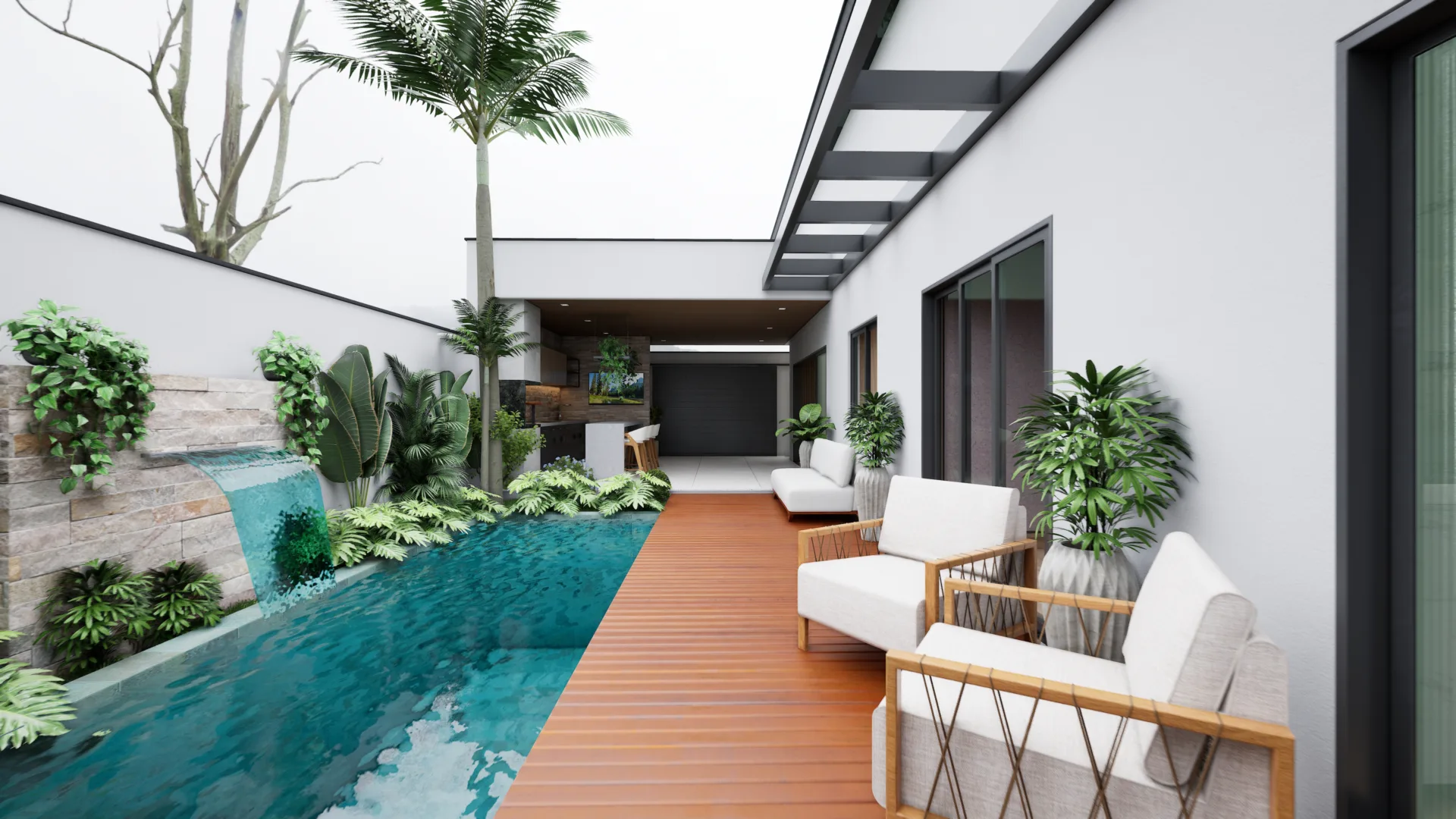 🌿 Destaque: a piscina central garante iluminação natural, frescor e vista panorâmica a partir de todos os ambientes da casa.