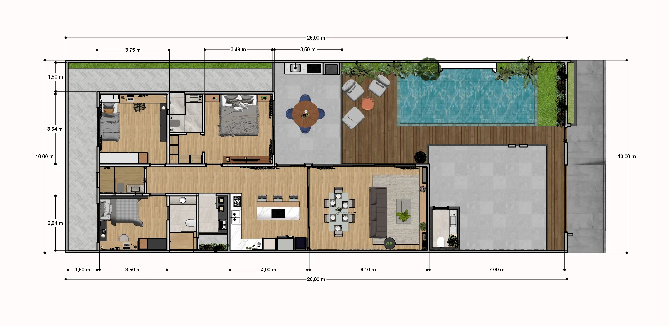 Projeto moderno com 164m² de área construída em um terreno de 10x26m. A casa conta com 3 dormitórios, incluindo uma suíte master e uma suíte solteiro, além de sala de TV, sala de jantar e cozinha com divisória em vidro. A lavanderia interna possui jardim de inverno, trazendo charme e ventilação natural. Na área externa, varanda gourmet, piscina com deck, lavabo e jardim completam o lazer. Ideal para quem busca conforto, elegância e funcionalidade em um só projeto.