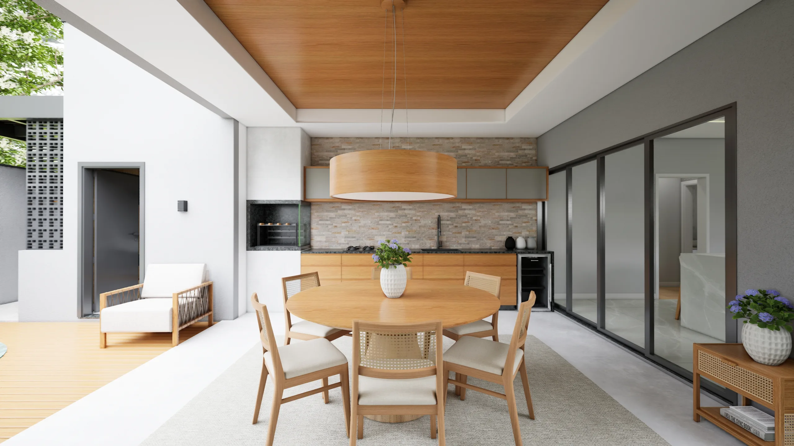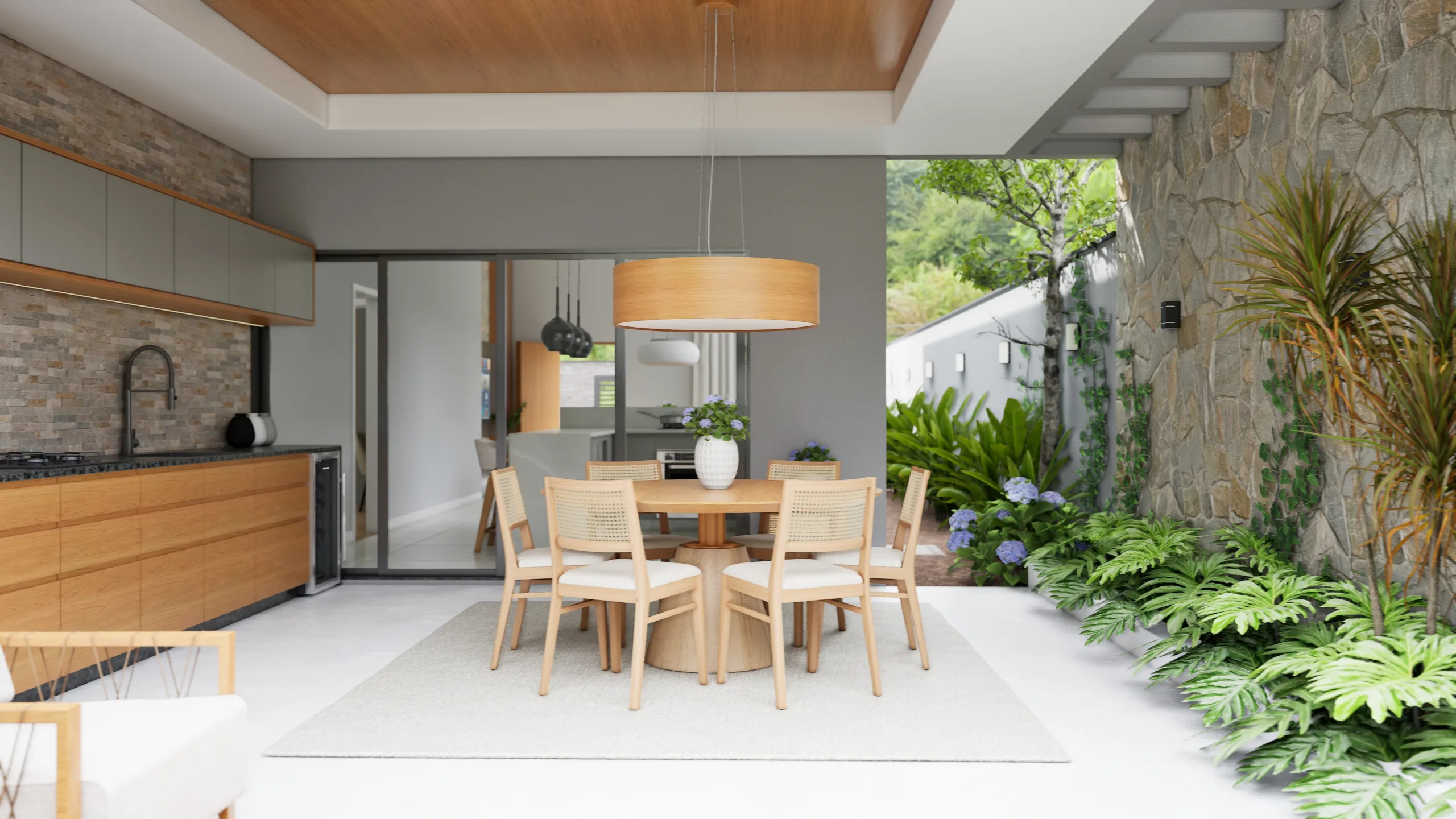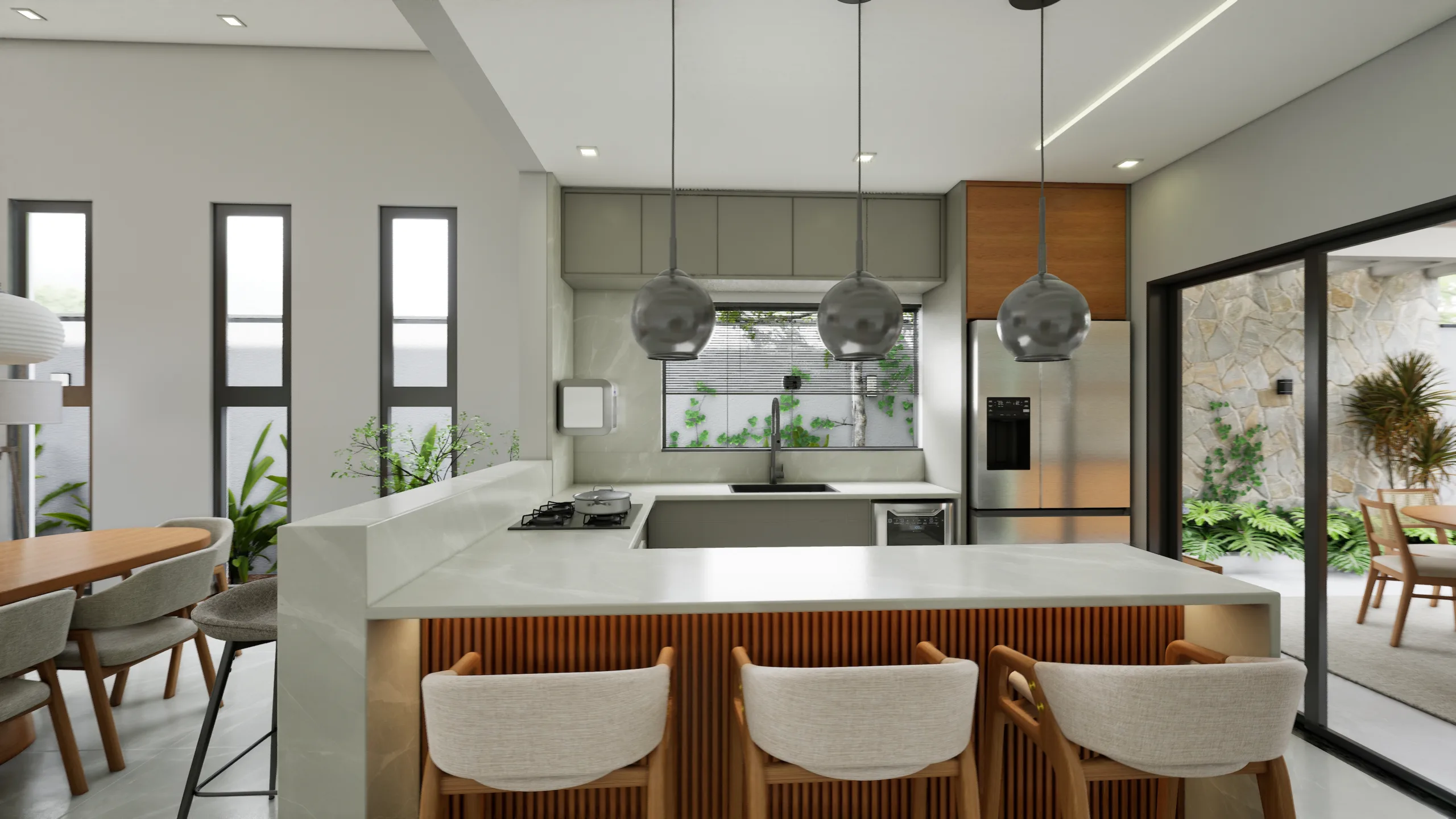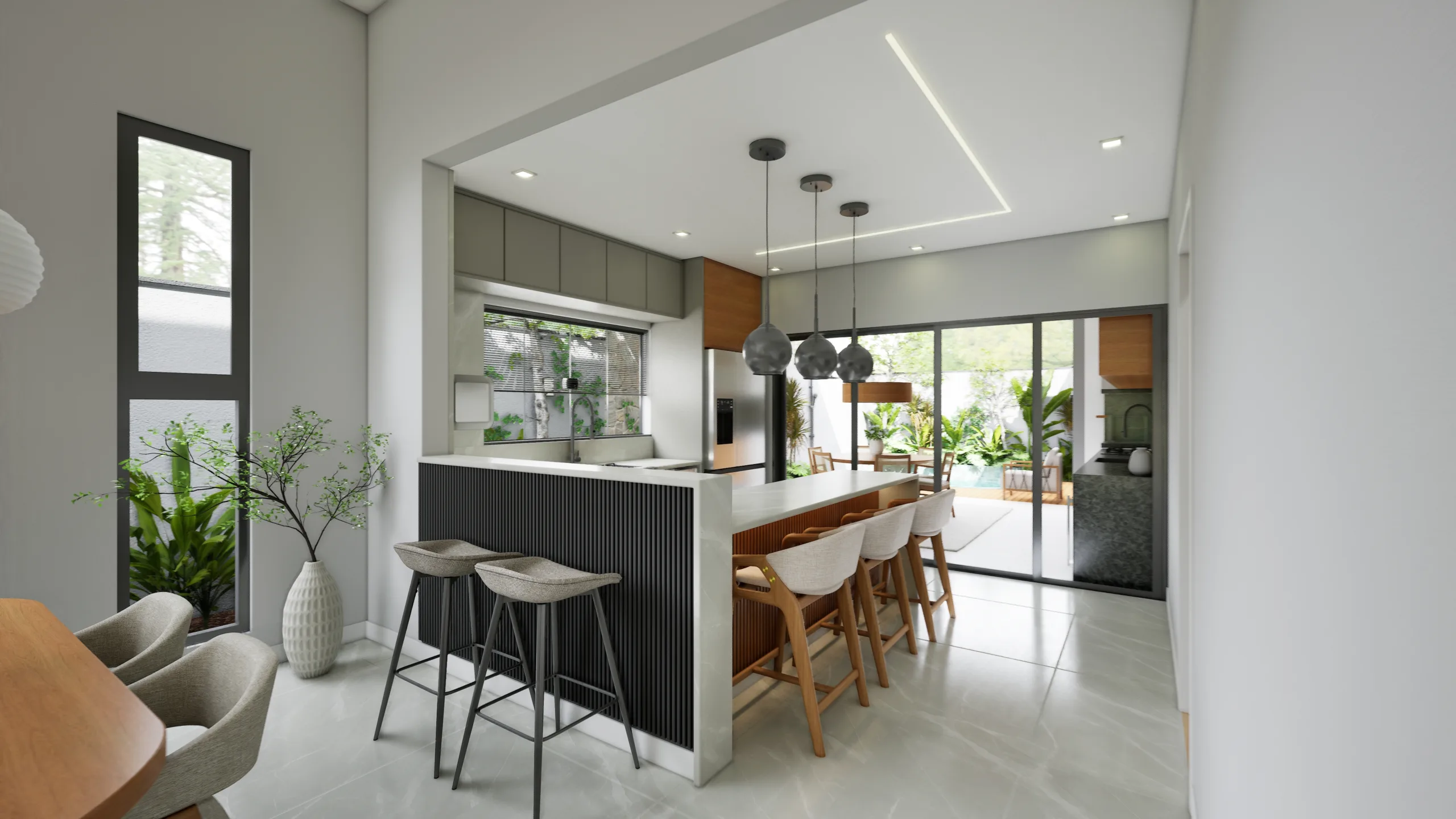 A cozinha foi pensada para otimizar o espaço e facilitar a circulação. Nos fundos da casa, destaca-se uma completa varanda gourmet, ideal para momentos de lazer, integrada a um elegante deck de madeira e a uma piscina compacta, formando um ambiente externo agradável e funcional. Ao lado, um lavabo de apoio atende perfeitamente essa área.