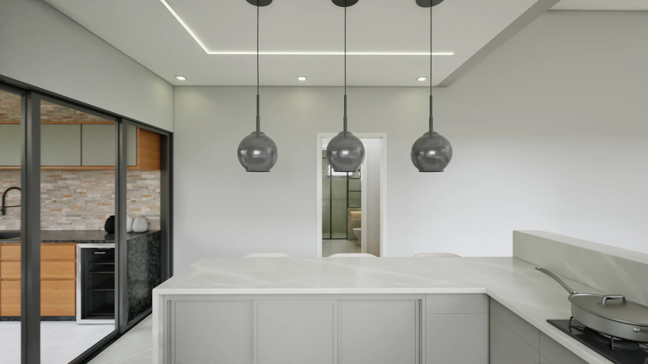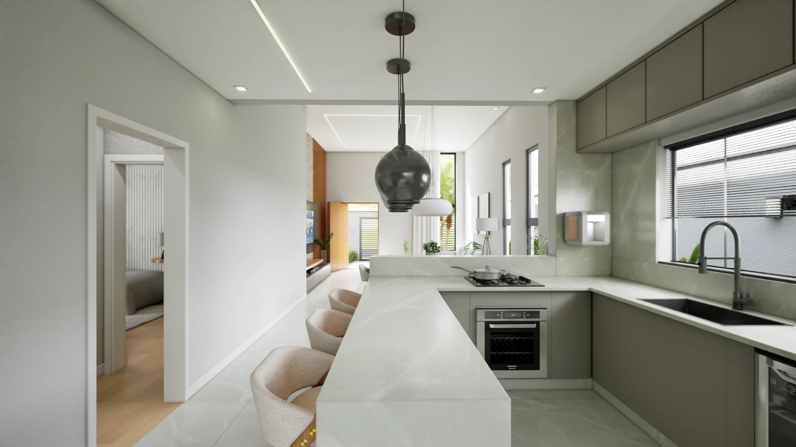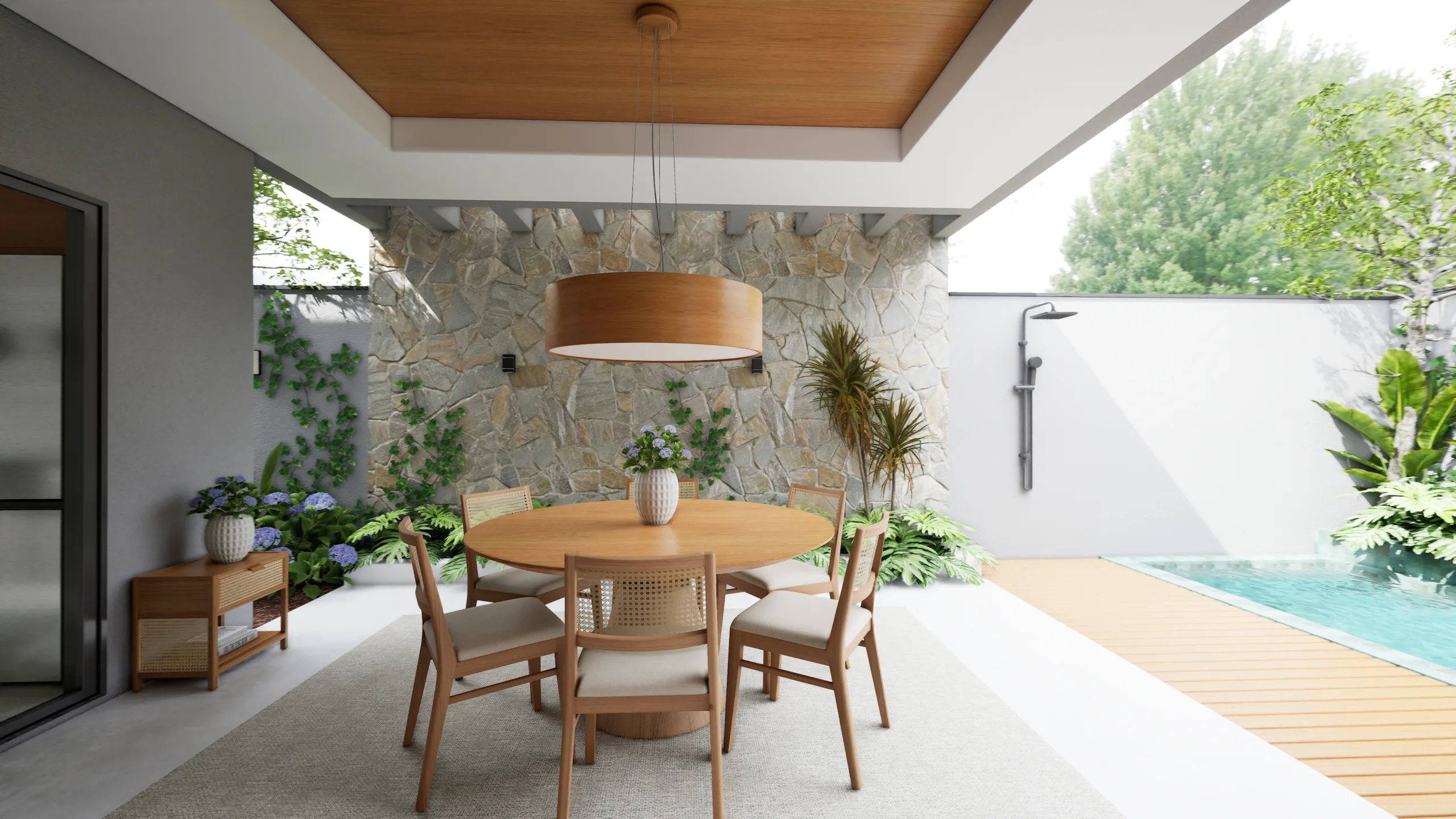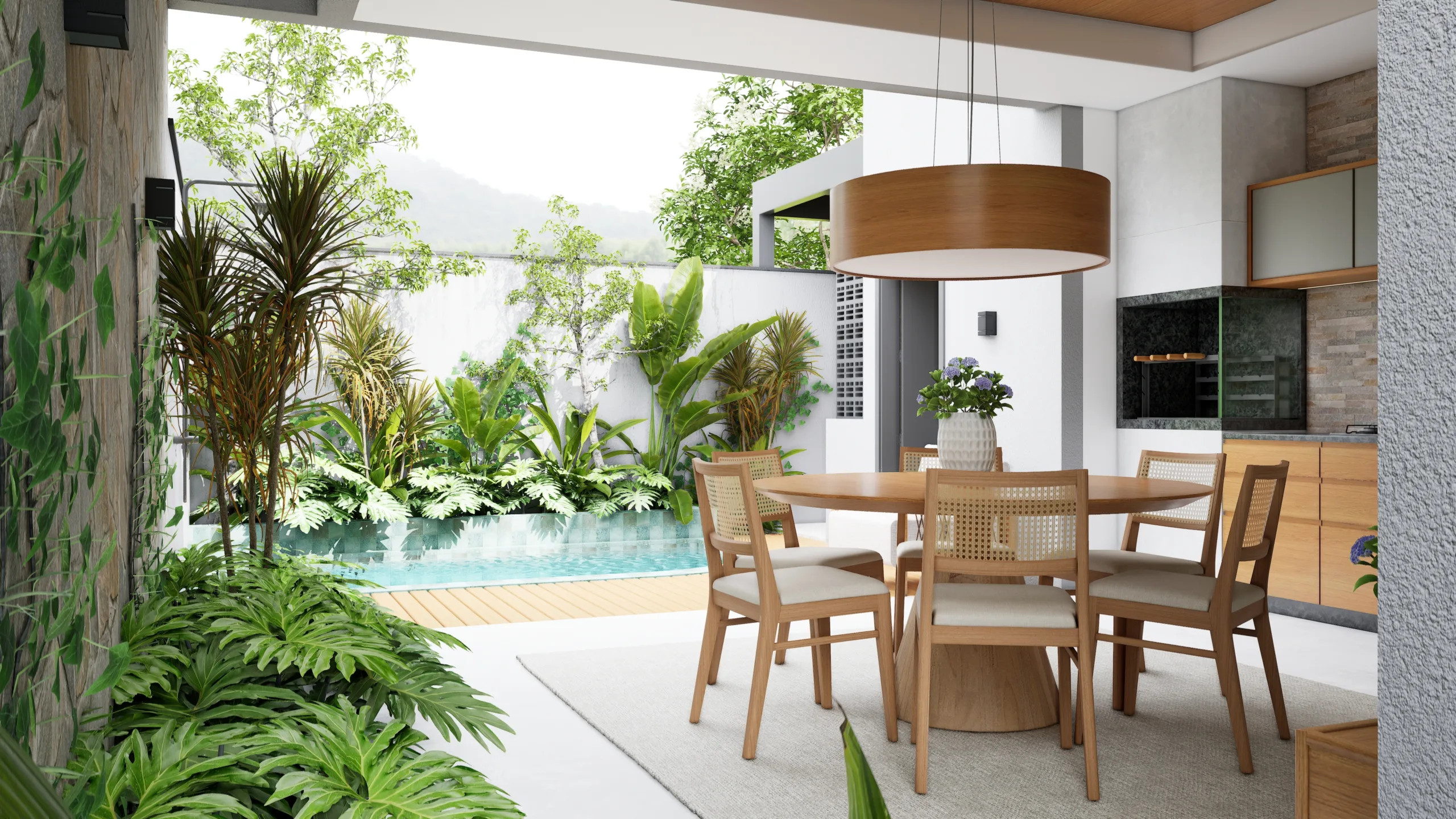 A cozinha foi pensada para otimizar o espaço e facilitar a circulação. Nos fundos da casa, destaca-se uma completa varanda gourmet, ideal para momentos de lazer, integrada a um elegante deck de madeira e a uma piscina compacta, formando um ambiente externo agradável e funcional. Ao lado, um lavabo de apoio atende perfeitamente essa área.