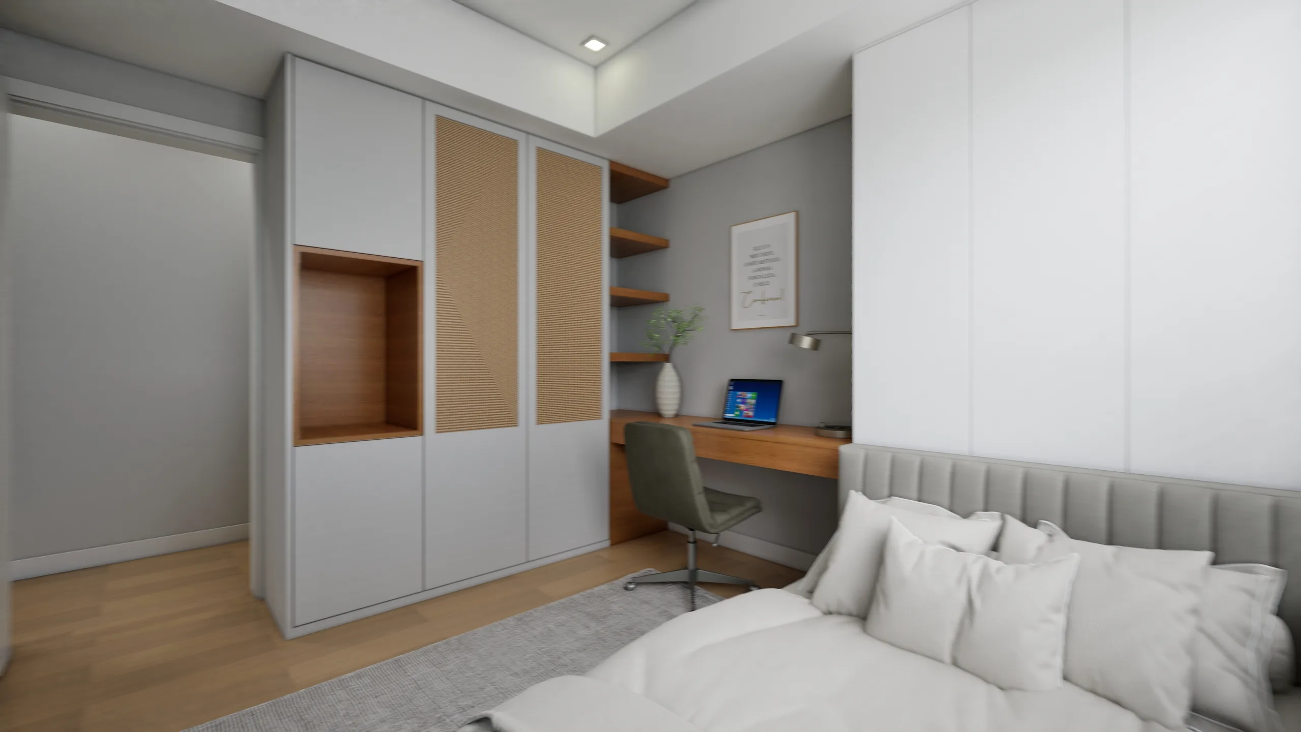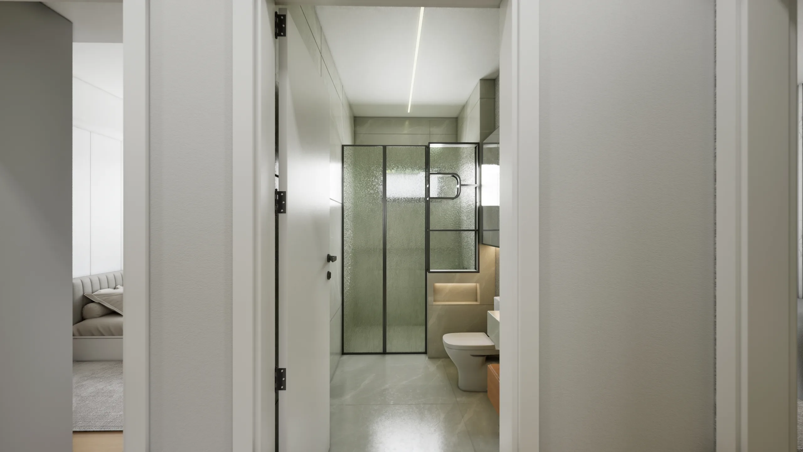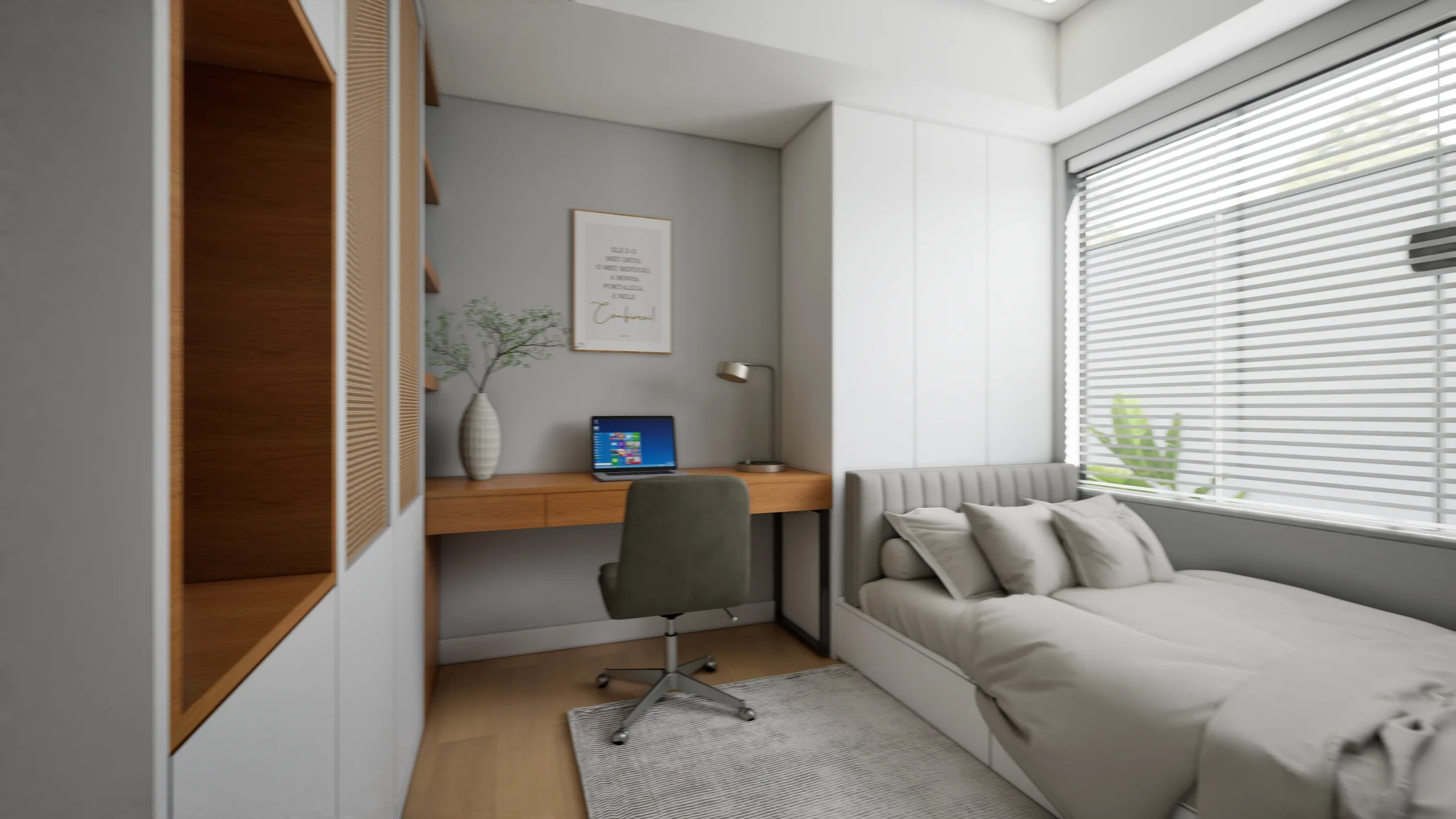 Na área íntima, o projeto conta com dois quartos bem distribuídos, atendidos por um banheiro social, que também serve aos visitantes. Além disso, a residência possui uma confortável suíte master com closet e banheiro privativo, oferecendo mais conforto e privacidade.