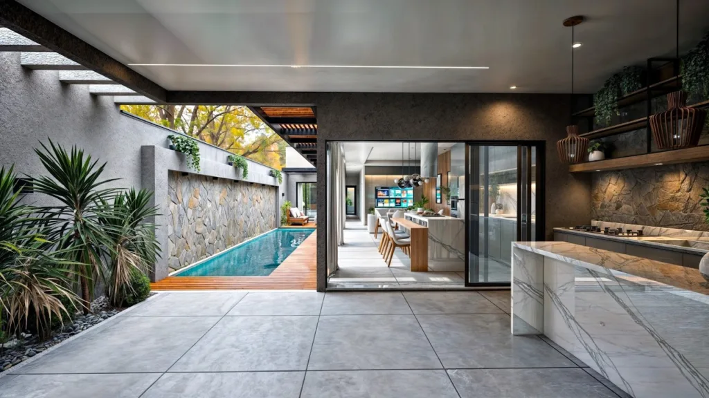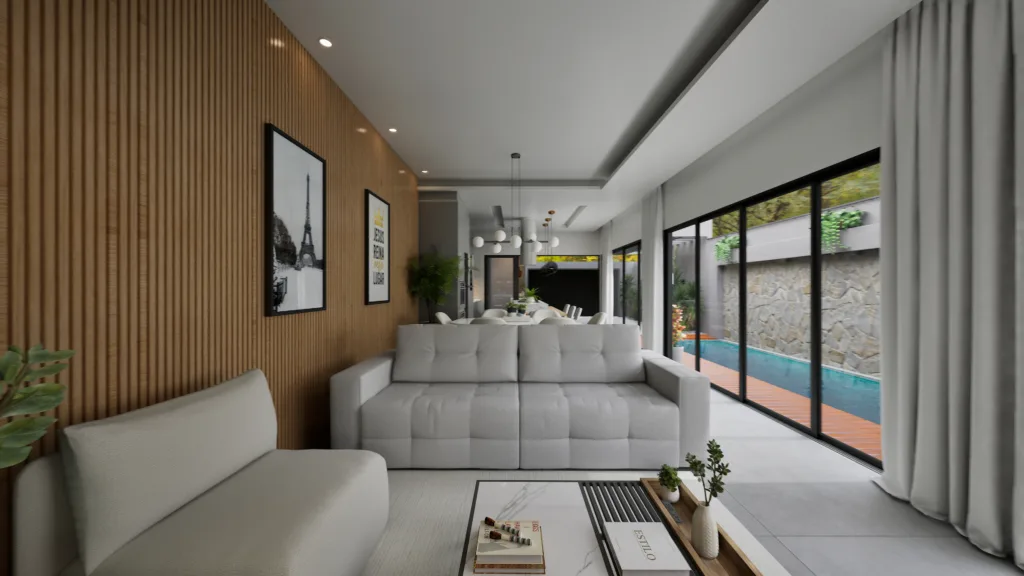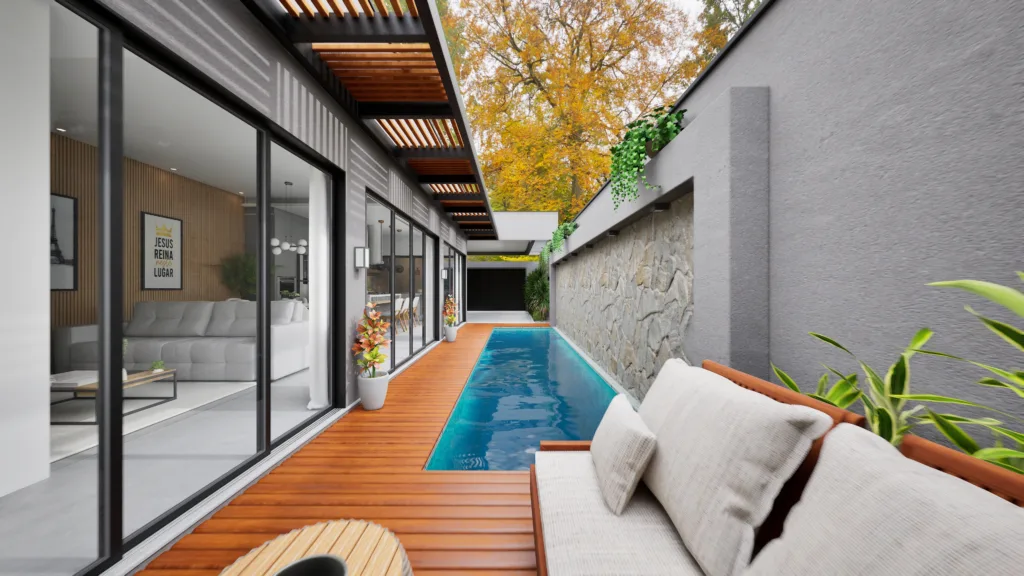 Projeto arquitetônico de uma casa moderna em L para terreno de 7x25m, ideal para quem busca praticidade e conforto em um espaço compacto. O design valoriza a ventilação cruzada e a luminosidade natural, criando ambientes arejados e acolhedores. Conta com duas suítes espaçosas, garantindo privacidade e funcionalidade para a família. Logo na entrada, um lavabo agrega praticidade ao dia a dia e recepção de visitas. A área social é integrada, proporcionando amplitude e fluidez entre os ambientes. Possui garagem para dois carros e uma elegante piscina nos fundos, perfeita para lazer e momentos de descanso. Um projeto pensado para terrenos menores, mas com todo o charme e conforto de uma residência moderna.