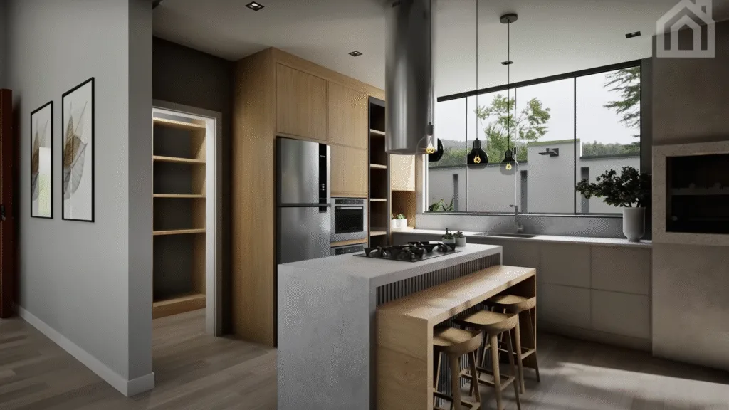 Cozinha com despensa – Organização e praticidade no preparo das refeições.