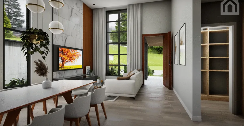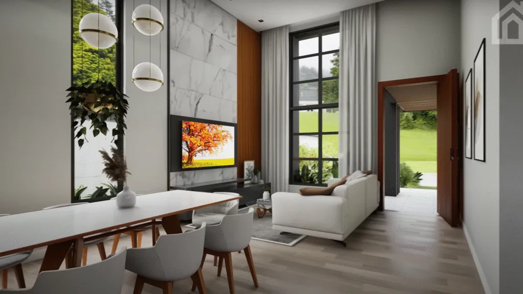 Sala ampla com pé-direito alto – Elegância, ventilação cruzada e sensação de amplitude.